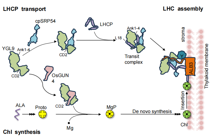 在本研究中,鉴定了水稻叶绿体信号识别颗粒43kDa (cpSRP43)蛋白YGL9,与拟南芥中cpSRP43的同源。YGL9突变导致黄绿色的叶片表型、LHCPs含量降低、光系统活性受损、叶绿素含量降低。研究发现,YGL9是一个双功能蛋白,通过同时调节LHCPs运输和叶绿素合成介导LHC组装:YGL9与cpSRP54相互作用,形成cpSRP复合物转运LHCPs;同时,YGL9还与OsGUN4相互作用并使其稳定,协同参与Chl的合成。此外,遗传学证据表明,YGL9与cpSRP54和OsGUN4在同一途径中调控LHCPs的运输和叶绿素合成。本研究揭示了LHCPs运输和叶绿素合成之间的相互关系,为单子叶植物的LHC组装过程提供了新的见解。