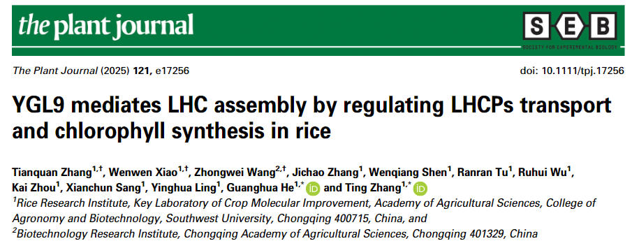 近日,公海gh555000aa线路检测水稻团队在 The Plant Journal上发表了题为《YGL9 mediates LHC assembly by regulating LHCPs transport and chlorophyll synthesis in rice》的研究论文,解析水稻LHC组装的分子机制。