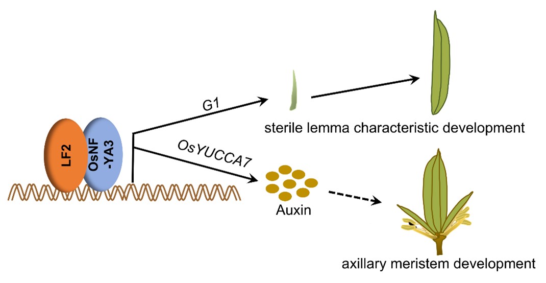 水稻每穗粒数是产量的重要指标,正常小穗由一个可育小花和两个护颖构成,仅形成一个籽粒。上世纪有学者提出,原始水稻祖先可能拥有三个小花,其中侧生小花退化为护颖。该团队于2017年首次报道lf1突变体,在护颖腋下形成完整侧生小花,证实了“三花小穗”假说,并揭示了lf1通过激活OSH1基因诱导腋生分生组织形成侧生小花的机制。在本研究中,团队进一步鉴定了新的侧生小花突变体lf2,其在护颖腋下同样发育出完整侧生小花;不同之处在于,lf2在副护颖腋下及护颖与顶生小花之间也能形成侧生小花,并表现出明显的护颖外稃化,总计在三个位置形成不同类型的侧生小花。研究发现,LF2基因编码一个SNF2家族SMACAL1亚家族染色质重塑因子,其蛋白定位于细胞核内;LF2蛋白能够与核因子NF-Ys的多个亚基相互作用,在转录水平上直接激活生长素合成基因OsYUCCA7及护颖发育基因G1的表达,从而正向调控IAA含量和护颖特征,影响水稻腋生分生组织的起始和护颖特征发育。该研究不仅为揭示水稻小穗中腋生分生组织抑制机制提供了新见解,也为侧生小花的恢复及进一步分子育种应用提供了理论支持。