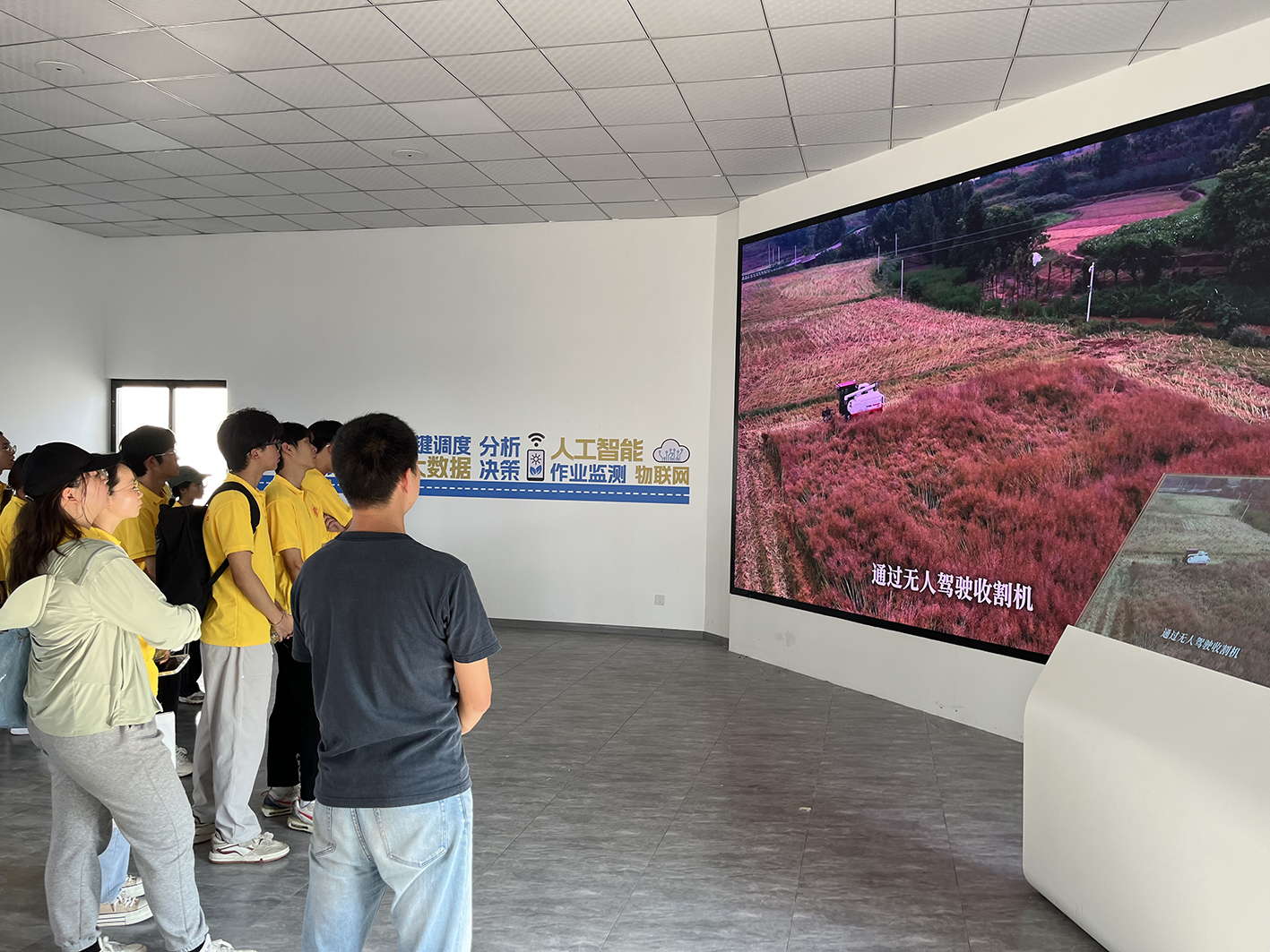 下午,在“江小白·未来农场”,现代智能农机的运用让员工们大开眼界。未来农场智能农机已经投入生产实践,智能农机依托北斗系统、物联网技术等现代技术,能做到多机互联,自动化、智能化操作,实现精准农业管理,提高当地油菜、高粱等作物产量和质量的同时减少人力成本和劳动强度。在观摩了无人操控农机作业的现场演示后,实践队员刘听尘同学感慨道:“老师课堂上讲过的无人驾驶农机作业,今天终于亲眼见到了,农业生产不再是面朝黄土背朝天”。